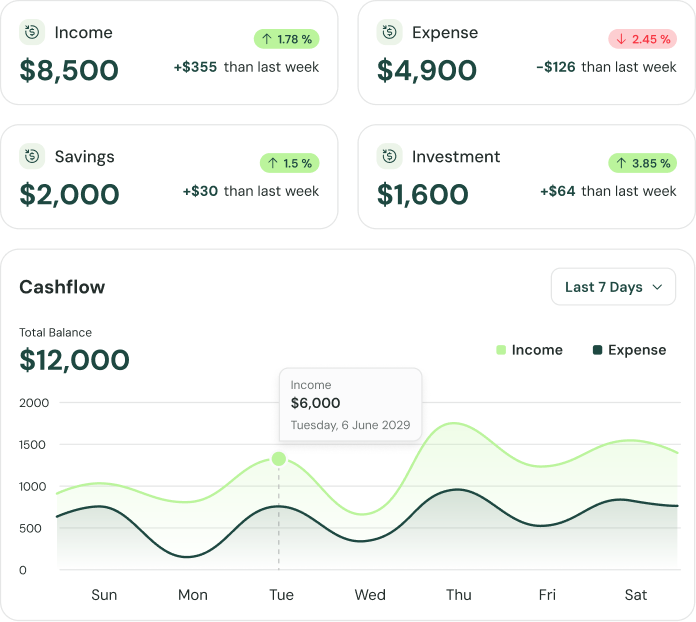 Our fintech platform takes the hassle out of managing your money by automating transactions, offering real-time expense tracking, and delivering smart financial insights. With our intuitive tools, you can effortlessly stay on top of your finances, gain better control over your cash flow, and make informed decisions that help you grow your wealth.